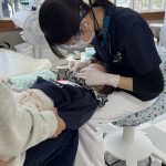 ある時、社員さんが「学生時代に経験した臨床実習は楽しくなかった」「実習で小児歯科に行く機会はほとんどなく、 稀にあっても泣く子を押さえつけて診療しており、そこでは子供の押さえ方を教えてもらいました」と話しているのを聞き、 それならこぐまで「学生さんが元気になる」楽しい臨床実習を経験してもらおう、「押さえつけない小児歯科もあることを知ってもらおう」そう思って始めました。 今では毎年10人以上の学生さんが参加してくれています。