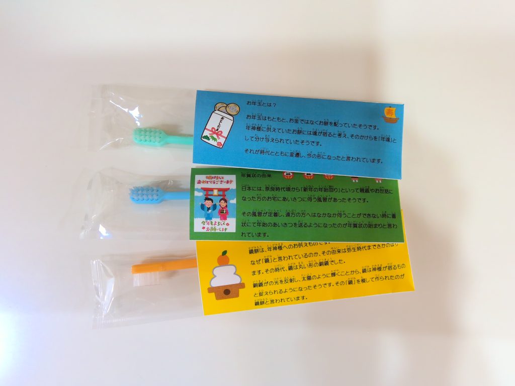 仕事始めには、お正月にまつわるお話を書いたものを歯ブラシのカバーにして患者さんにプレゼントさせていただきました。私自身も初めて知る内容も多く、すごく勉強になりました!